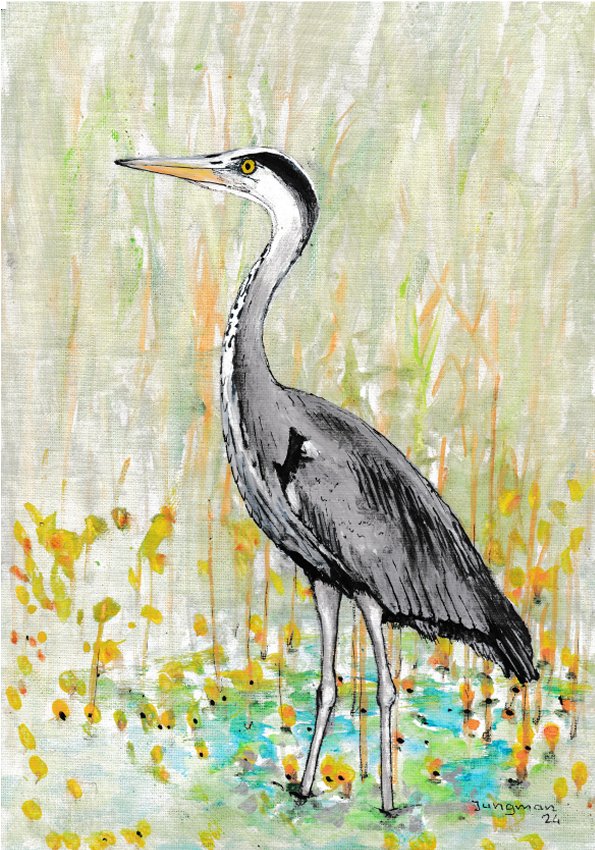 621 Aquarel op canvas.Reiger. Afm. 21 x 30 cm.