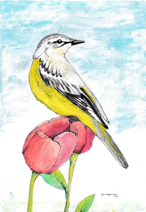 629 Aquarel op canvas.Kwikstaart. Afm. 21 x 15 cm.